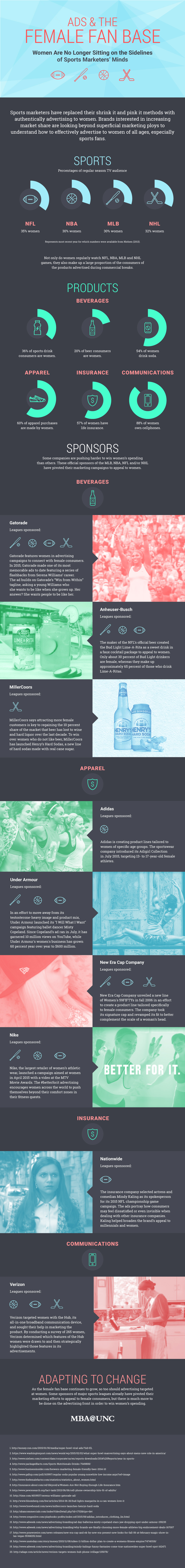 In this infographic, MBA@UNC shows the effect female consumers are having on traditional sports marketing by looking at how sponsors of four American sports leagues — the NFL, NBA, MLB, and NHL — have pivoted their marketing campaigns to win over women. We hope this infographic will inspire you to take a page out of these sponsors’ playbooks to effectively advertise your products to the female fan base.